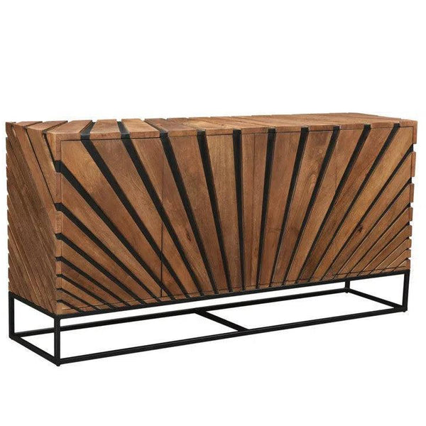 Take a risk and elevate your dining room with our Virtual Modern Sideboard. This bold piece combines rustic charm with elegant art deco style, featuring a unique sunburst pattern crafted from specially finished mango wood. Its sturdy black iron frame and ample storage space are sure to inspire a sense of adventure.