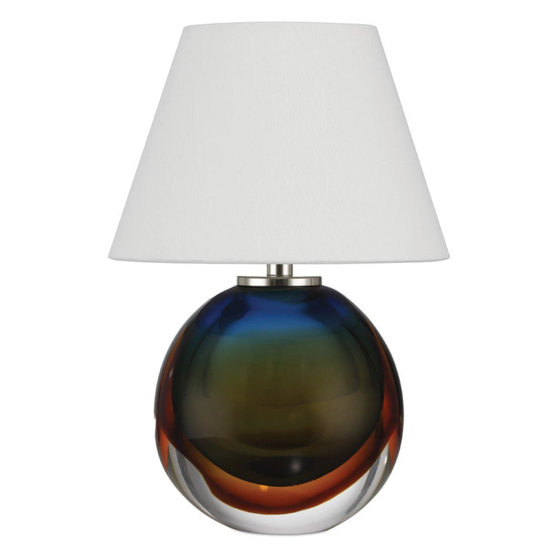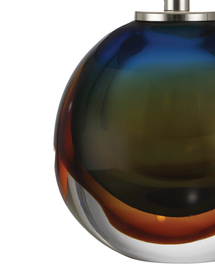 The Voyage Nickel Cordless Table Lamp brings a touch of elegance and functionality to any space. Crafted from art glass, this lamp showcases a unique blend of blue, amber, and clear glass, creating a beautiful orb shape. The layered glassblowing technique gives it a subtle green glow at the center, adding depth and dimension to its appearance. Its multi-color design, featuring blue, green, and brown hues, complements various decor styles, making it a versatile choice for your home.