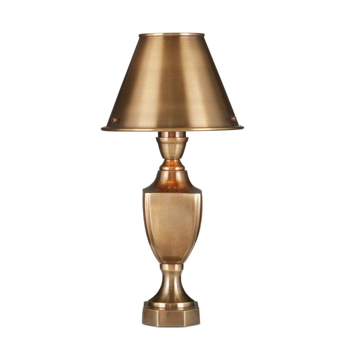 The Waddill Table Lamp is a petite design at 13 inches tall and 6 inches in diameter. Made of solid brass in an antique brass finish, it takes the form of a classic trophy with subtle geometric detailing. The lamp is fitted with candelabra bulbs and operated by a line switch, combining a traditional silhouette with functional simplicity.