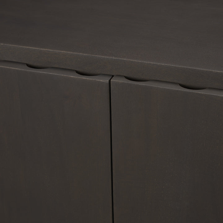 The wooden accent cabinet, crafted from solid mango wood, brings a unique touch to any room with its deep, dark brown finish. Its design features elegant scalloped arched cutouts on the recessed base, with matching arched detailing on the cabinet doors. These thoughtful details not only add a sophisticated look but also serve as concealed pulls, making the piece both functional and stylish. The Wagner cabinet is perfect for those seeking to add a touch of elegance and practicality to their space.