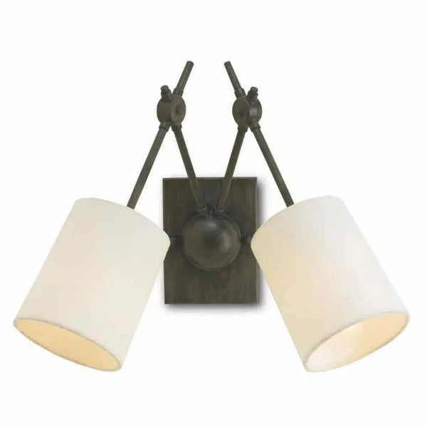 The angular arms and black Iron finish on the Compass Wall Sconce hold references popular during the Industrial Age. The rings that connect the arms on this black sconce have a machined feel to them, appearing as if they could raise the two white linen shades that angle away from each other.