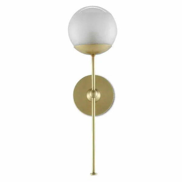 A special design attribute of the Montview Wall Sconce is its long stem holding its frosted glass globe in place. Made of metal in a brushed brass finish, the gold sconce reminds its designer, Clarence Mallari, of a planet in the solar system. The Montview is certified for damp locations.