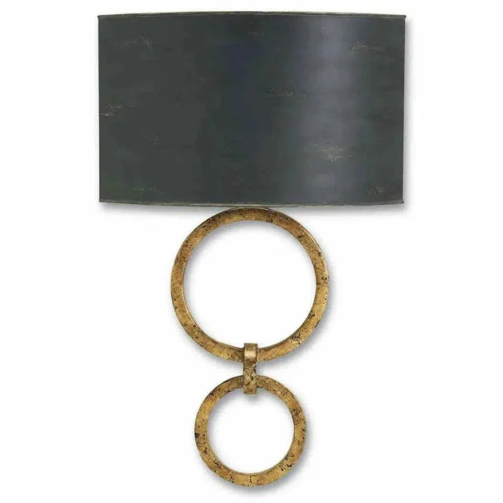 Proving that textural patina can turn up the volume on style, the Bolebrook Wall Sconce uses the gold leaf finish on its frame to make its impact. The French black finish on its shade draws out the darker tones on the rings of this gold sconce, which meets ADA requirements.