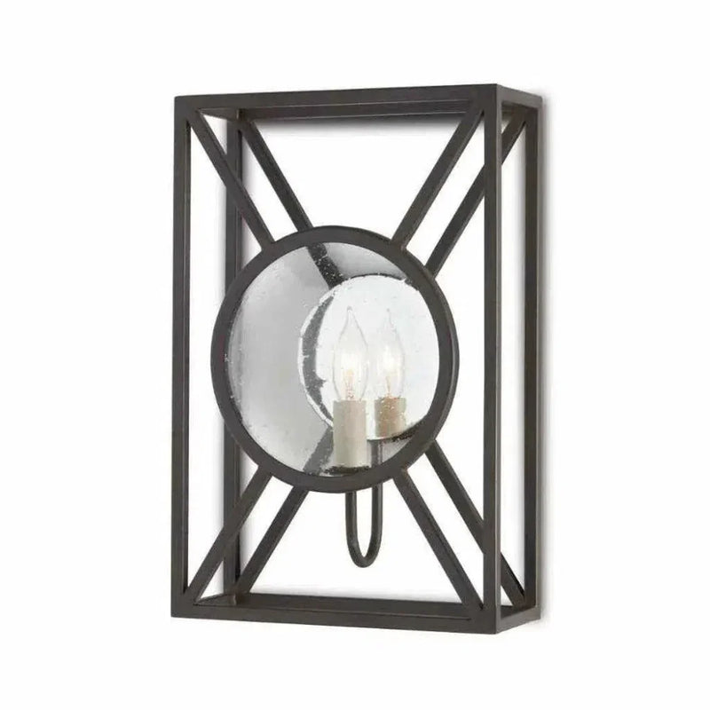 The Old Iron Beckmore Black Wall Sconce embodies sophistication and luxury, with a mirrored glass reflector and seeded glass front panel that create a dazzling effect in any living space. Available in both old iron and silver finishes, as well as a lantern design, this certified sconce serves as both a light source and a statement piece. Elevate your home with its elegant design from the Lillian August Collection.