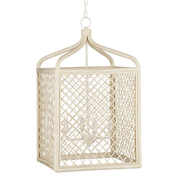 Achieving a traditional lantern shape entirely from wicker is a feat, one that was beautifully realized when artisans wove the Wanstead Lantern from the natural material. Both the thin and thick ribs intermingling to create the wicker lantern have been bleached to lighten the design. The vanilla finish on the hardware enhances the airiness of the lantern's profile.