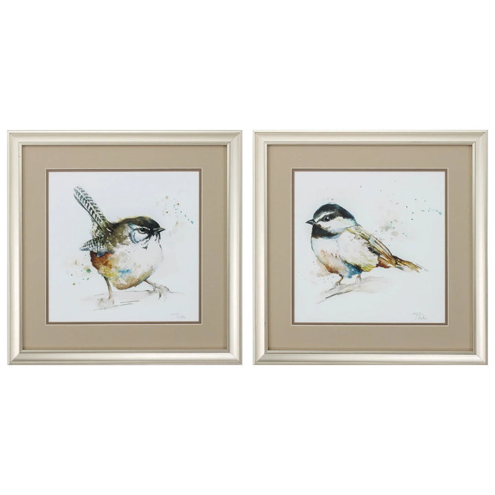 This set of two framed bird prints brings the tranquil beauty of nature to your home. Each piece captures birds in a watercolor style, melding hues of brown, blue, black, white, and beige. The artwork is elegantly double matted, adding depth and sophistication to the presentation. Encased under glass with a champagne-colored frame, these prints are sure to enhance any room with their calming, casual style. The light beige frames complement the neutral tones of the prints, making them a versatile addition to various decor themes.