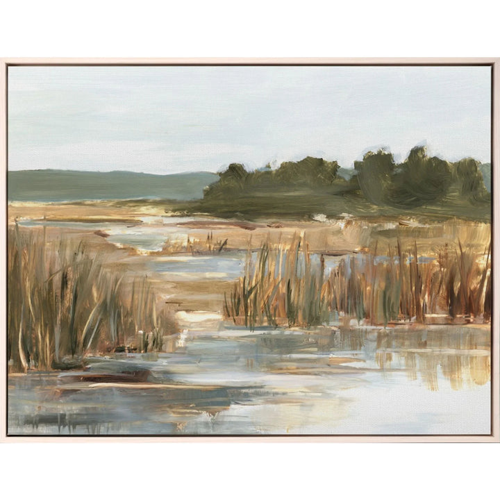 Immerse yourself in a serene marshland setting with the Wetland Grasses II Canvas Art With Wood Frame. This artwork invites tranquility into any room, presenting a calming vista of grasses and water in earthy tones of green, brown, and beige. The canvas is masterfully wrapped around sturdy wood stretcher bars, providing a seamless and polished look. Mounted in a whitewash wood floater frame, this piece exudes a transitional style that effortlessly complements a variety of interior designs. Its horizontal orientation makes it a perfect fit for above sofas, in hallways, or as a statement piece in any living space.