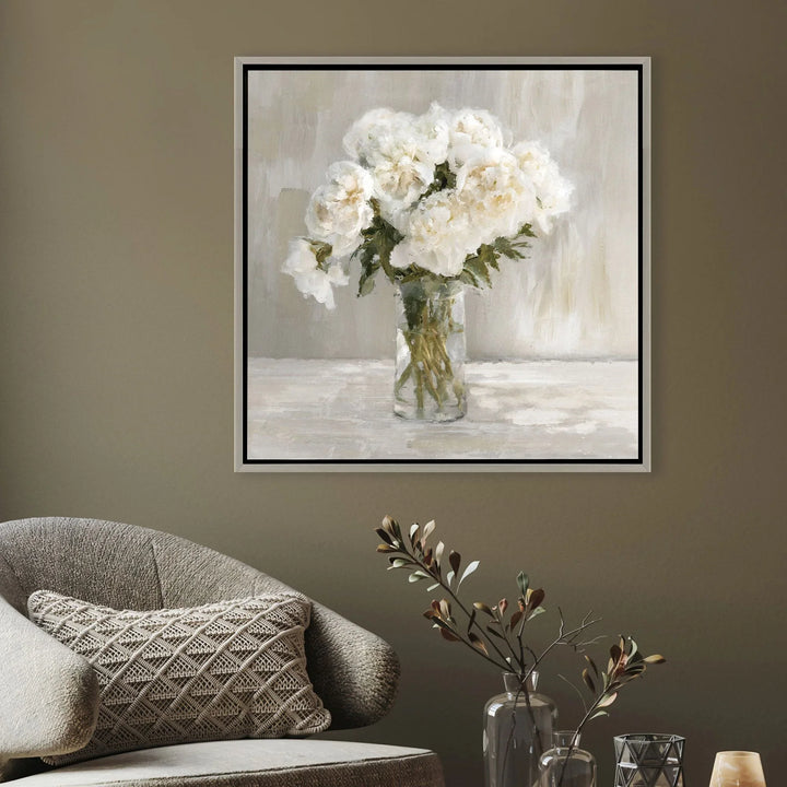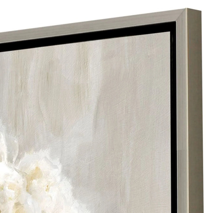 This elegant white flower bouquet art piece brings a touch of sophistication to any room. It features a graceful floral arrangement that complements modern traditional interiors. The art is presented on a sturdy canvas, which is elegantly mounted within a brushed silver floater frame. This combination ensures it not only enhances your space aesthetically but also offers durability and timeless appeal.