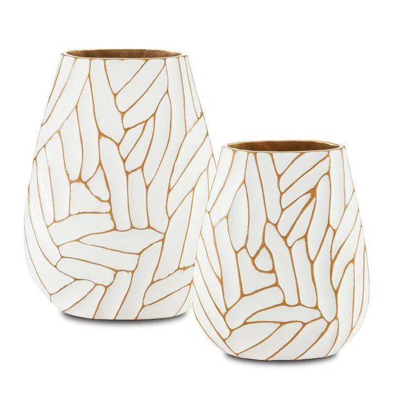 Experience the opulent refinement of our White Gold Anika Vase Set of 2. Decorated with delicate gold and white details, these cast aluminum vases exude an artistic charm, featuring shimmering gold interiors that add a touch of sophistication.