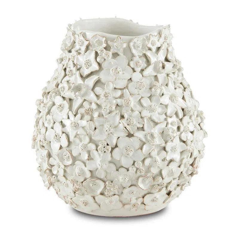 With a surface that is studded with beautifully fashioned white flowers, the Jessamine White Vase is truly an artisanal piece. Rather than apply one type of bloom, a number of floral shapes are intermingled to give the white decorative accessory a charm that is heightened by the top edge that undulates. The handmade character of the piece comes from the fact that each flower is created individually and applied, one-by-one, by hand.