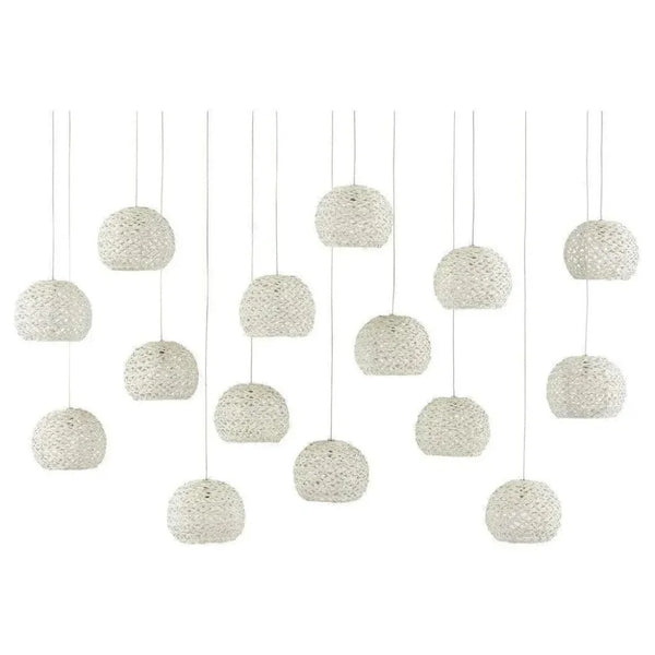 The shades on the Piero Rectangular 15-Light Multi-Drop Pendant may appear to be woven from a natural plant material, but they are made of iron in a white finish to make it one of our offerings that illustrates the skills our craftspeople bring to their work. When the white pendants are illuminated, textural patterns will enliven surrounding surfaces. The canopy of this piece is luminous in a painted silver finish. This fixture is among Currey & Company's multi-drop pendant collection, which includes multiple configurations.