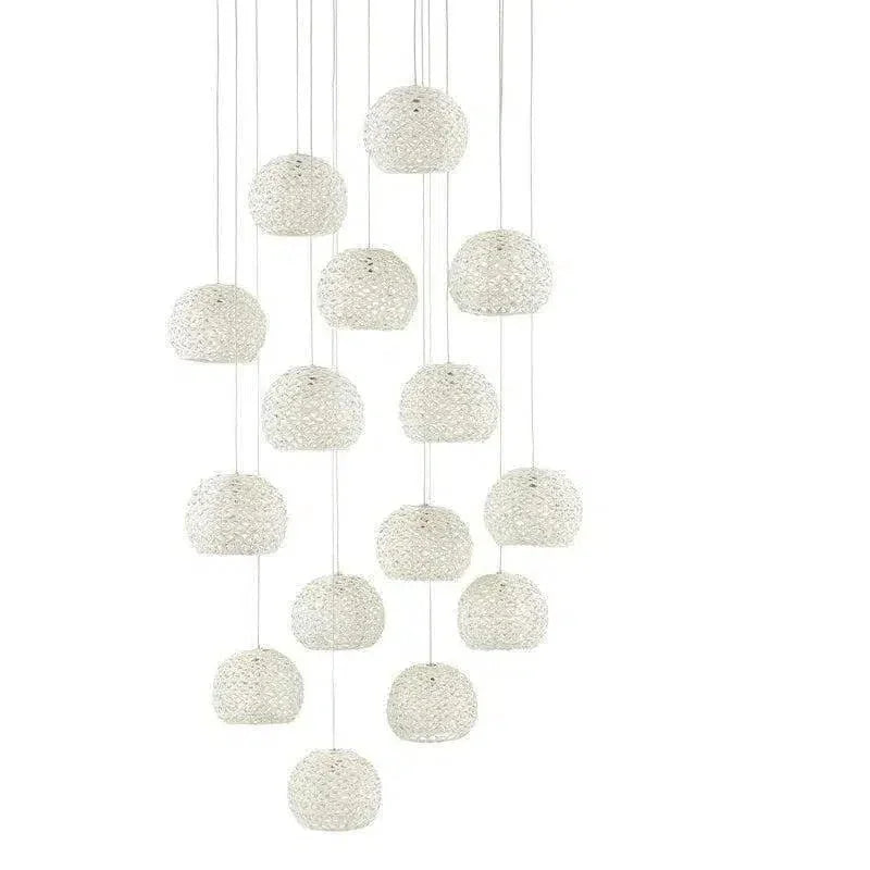 The shades on the Piero Round 15-Light Multi-Drop Pendant may appear to be woven from a natural plant material, but they are made of iron in a white finish to make it one of our offerings that illustrates the skills our craftspeople bring to their work. When the white pendants are illuminated, textural patterns will enliven surrounding surfaces. The canopy of this piece is luminous in a painted silver finish. This fixture is among Currey & Company's multi-drop pendant collection, which includes multiple configurations.