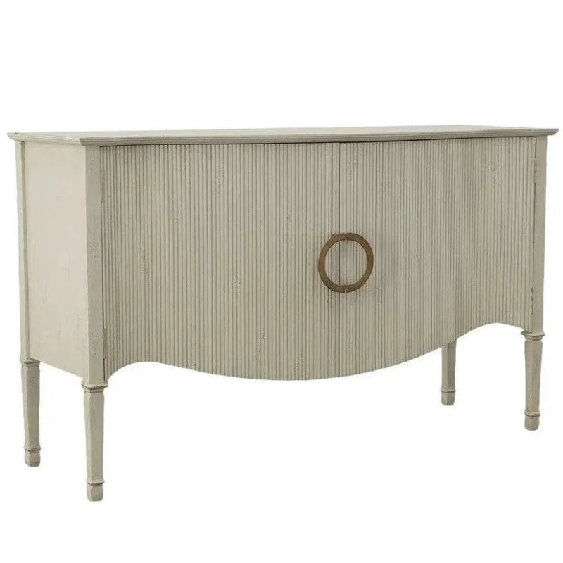 Subtly curved to add even more visual charm, this commodious sideboard features a practical adjustable shelf behind its uniquely routed doors. The solid mahogany frame is enlivened by the application of a lightly distressed cream finish. The quiet beauty of this sideboard is emphasized by the distinctive brass pulls.