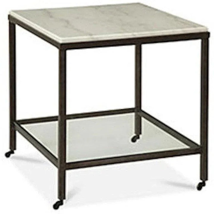 The Whitman Square End Table features a striking contrast between bronze and ivory marble. The solid stone tops rests on a steel base and features piano casters for added functionality. This square end table is accented with a clear glass shelf for extra storage. Dare to make a statement with this bold, elegant square end table.