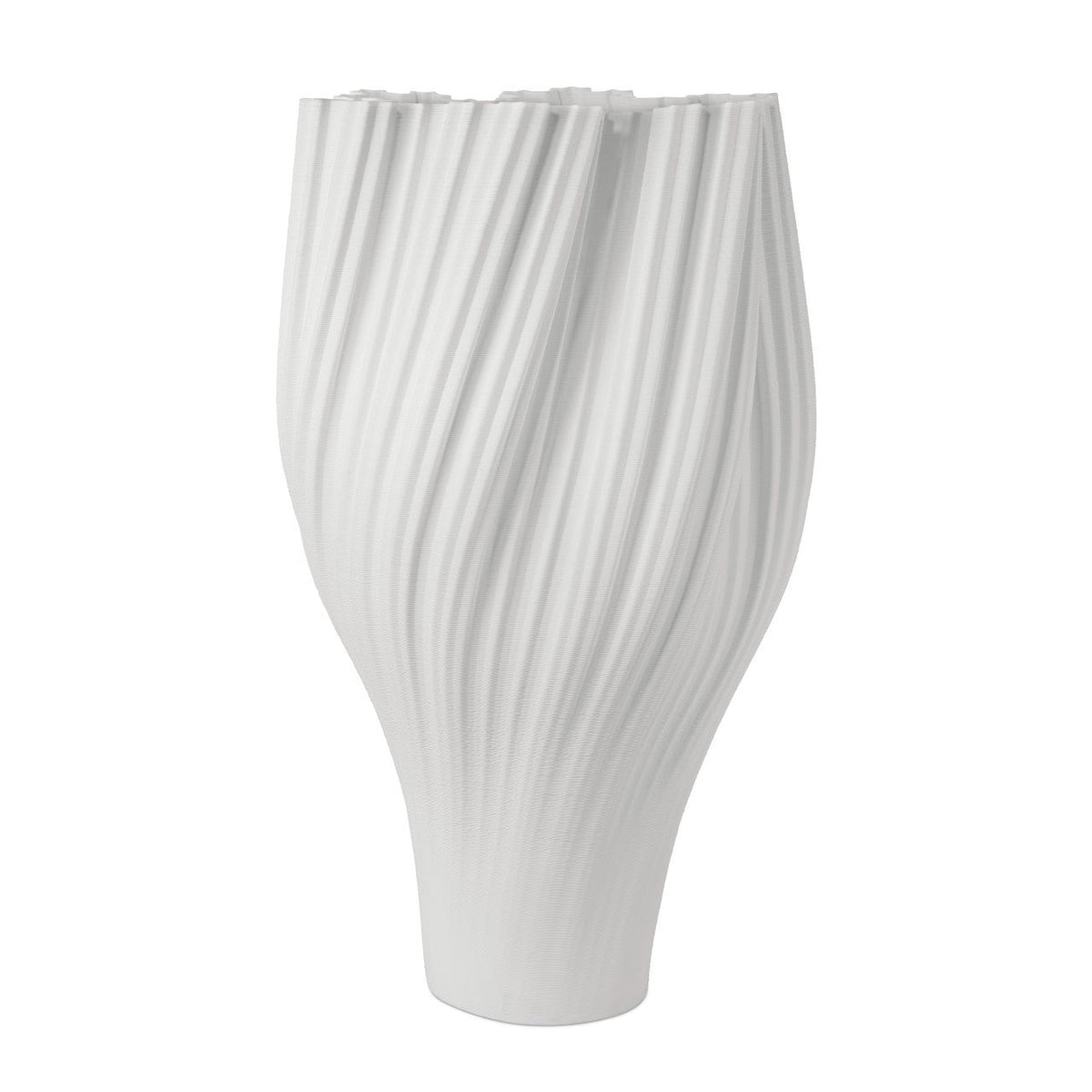 The Whorl Grande White Vase is crafted from 3D-printed porcelain to resemble an elegant upside-down tassel. Its swirling, fluid shape gives the impression that the vase is gracefully flowing upward. The movement of the white porcelain enhances the sculptural form, making it a dramatic accent. With its impressive size and eye-catching design, the Whorl Grande White Vase commands attention. This vase is not watertight.