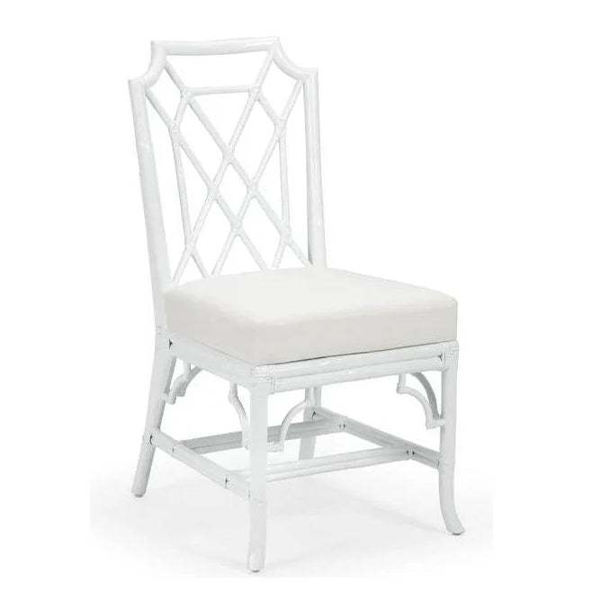 Want the perfect balance of style and comfort? The Wild Palm Rattan Frame White Side Chair offers cushioned seating that makes long dinners a pleasure. The supportive cushions provide comfort while maintaining an elegant appearance.