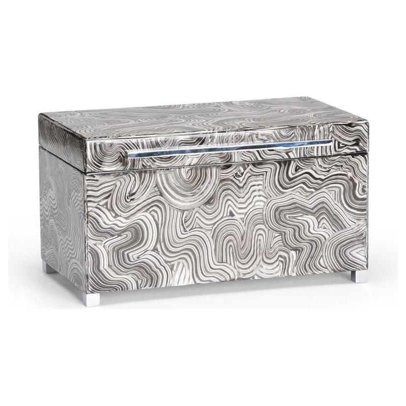 This beautifully crafted storage box is a perfect blend of functionality and style. With its modern design, it features a hand-painted wood body that showcases a sophisticated Grey color adorned with unique swirling patterns. The elegant polished nickel handle adds a touch of glamour while ensuring easy access to your stored items. Designed to complement any room, this box serves as an ideal solution for organizing items discreetly without sacrificing style. The box's rectangular shape provides ample space for storing various items, making it versatile for use in different parts of your home. Whether placed in the living room, bedroom, or office, its sleek appearance enhances the decor with a touch of elegance.