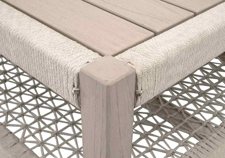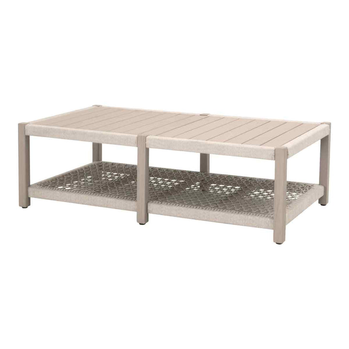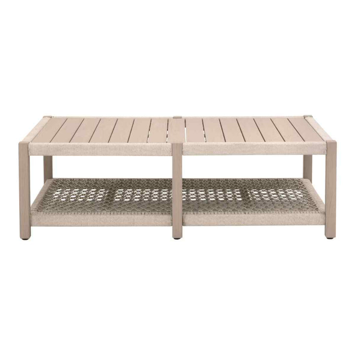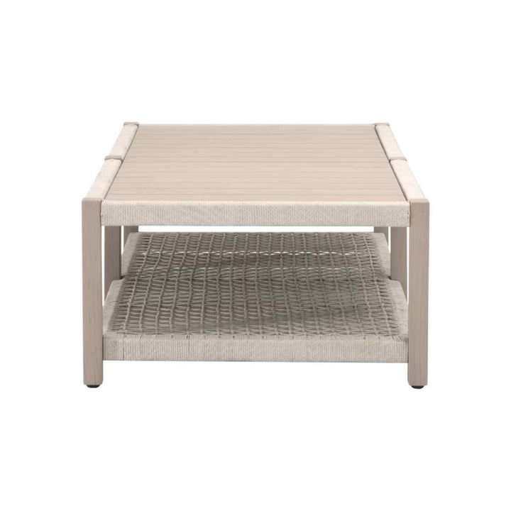 Introduce sophistication and functionality to your outdoor oasis with the Wrap Outdoor Coffee Table by Essentials For Living. This transitional table, crafted from solid teak wood with gray and washed ever undertones, exudes coastal style and practicality with intricate knotted rope details. The unique rope shelf and edges provide storage and add a touch of woven design to your outdoor space. Measuring 56.25" wide, 32.25" deep, and 17.75" high, this table is perfect for outdoor lounging areas, offering ample surface area for drinks and other essentials. With adjustable feet levelers for stability and easy KD construction for effortless assembly, this table is the perfect addition to any luxury outdoor living area. Transform your outdoor space into a refined oasis with the Wrap Outdoor Coffee Table by Essentials For Living.