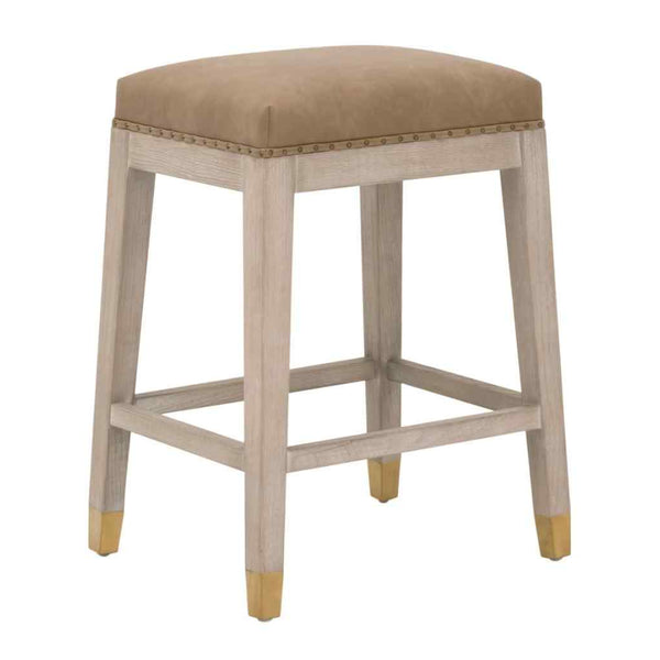 The Wyatt Counter Stool by Essentials For Living brings a touch of farmhouse charm with its solid craftsmanship and stylish design. Its frame is made from solid ash wood in a natural gray finish, giving it a cozy and textured look. The seat is wrapped in Ivanhoe Toast vegan leather, complemented by plush foam for a comfy sitting experience. Gold nail tacks and flat piping add a refined touch, while gold metal feet caps provide an elegant finish. This stool is perfect for any counter space, offering timeless appeal with its sturdy four-way footrest and durable design.