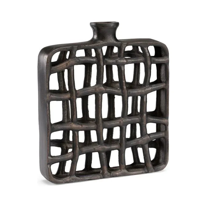 The Xavier Urn is a striking home accent that brings a touch of elegance to any space. With its dark bronze finish, this urn is crafted from aluminum, providing both durability and a classic look. The textured surface enhances its visual appeal, making it a standout piece in any room. The urn's narrow top opening adds a unique design element, perfect for showcasing dried flowers or decorative branches. Its square vase shape and open grid design contribute to its modern yet timeless aesthetic, seamlessly blending with various decor styles. Part of the Wildwood Collection, the Xavier Urn offers versatility and style.