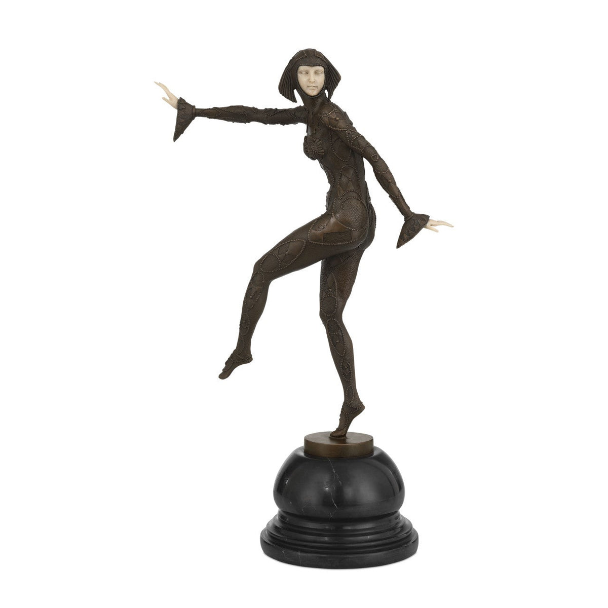 The Zanni Sculpture depicts a dancing harlequin crafted from composite with a fanciful swirling treatment on her black costume that resembles strings of pearls. Her face and hands are rendered in a natural flesh tone, while her outfit is detailed with a bustier, flouncing sleeves, and a dramatic headdress. The lively figure prances atop a stacked black marble base, adding weight and contrast to the whimsical design. Because it is made of an artisanal material, its surface may vary slightly from sculpture to sculpture.