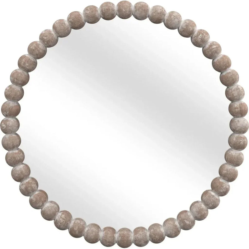 Zeena Wall Mirror is round featuring a bead-like frame with a white washed finish. Finish: white wash, clear glass mirror. Material: wood, MDF, clear glass mirror. Wall Mounting: Two "D" ring attachment points for ease of access wall mounting is included to hang mirror. The hand crafted details produced by a skilled artist lends itself to a unique technique and will vary slightly.