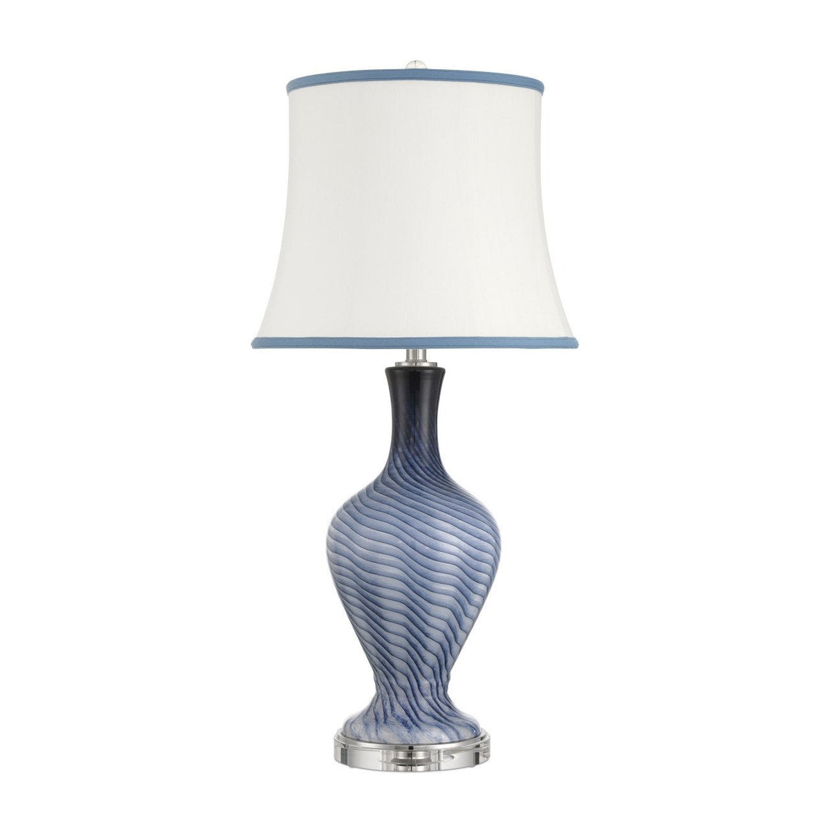 The Zeta Blue Table Lamp is crafted from grayish-blue glass with a swirling pattern created using two molds, a technique that gives the surface the feeling of movement. Its shape is inspired by a 19th-century antique Zanfirico glass vase, reminiscent of the artistry of Murano glassmakers. The lamp rests on an optic crystal base with a coordinating crystal finial, while a softback shade trimmed in blue echoes the tones of the glass body. Because it is made of an artisanal material, its surface may vary slightly from lamp to lamp.